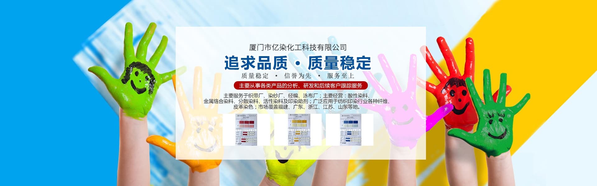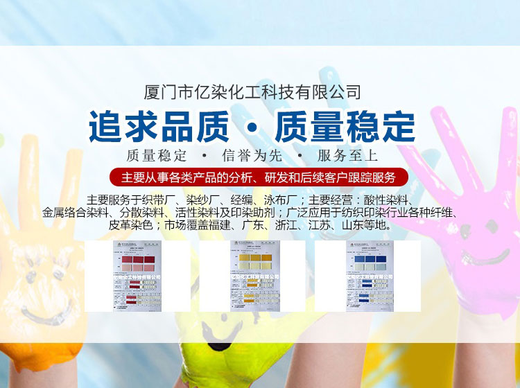 廈門市億染化工科技有限公司是一家集研發(fā)、生產(chǎn)、銷售一體的綜合型企業(yè)。公司主要經(jīng)營(yíng):酸性染料、金屬絡(luò)合染料、高牢度分散染料及印染助劑。公司信守“以誠(chéng)信贏合作、以質(zhì)量贏市場(chǎng)、以創(chuàng)新贏發(fā)展、以服務(wù)贏生存”的企業(yè)精神服務(wù)于廣大客戶,多年以來建立了良好的市場(chǎng)口碑,市場(chǎng)遍布福建、廣東、浙江、江蘇、山東及東南亞國(guó)家,與多家知名企業(yè)建立了長(zhǎng)期合作伙伴關(guān)系!